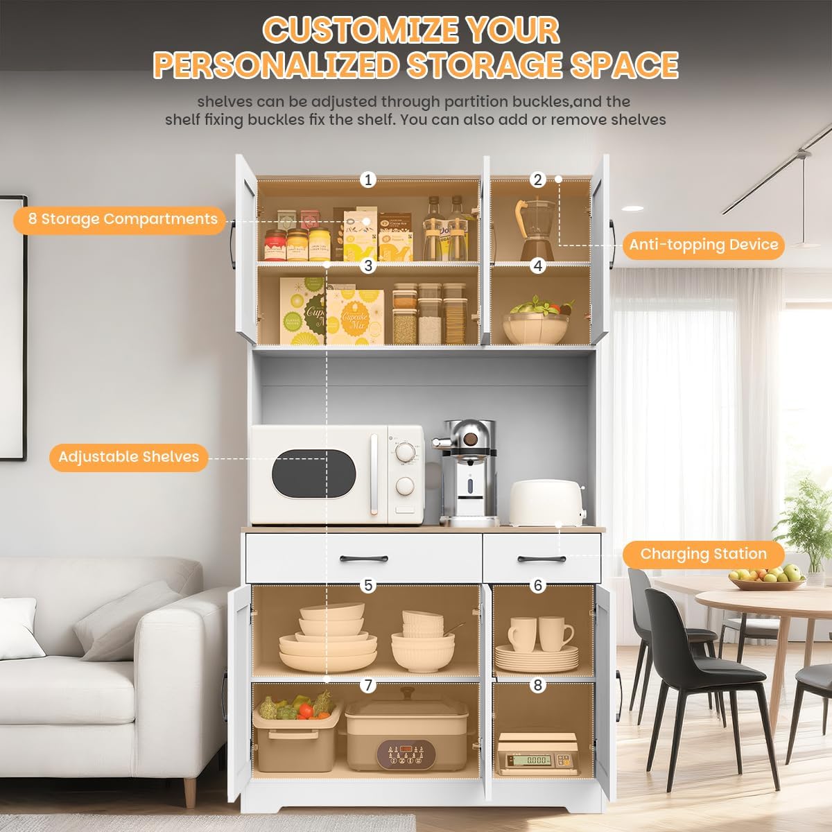 67" Tall Pantry Cabinet with Charging Station, Pantry Storage Cabinet with Drawers and Shelves, Food Pantry with Microwave Stand, Cupboard for Kitchen, Dining, Living Room, White