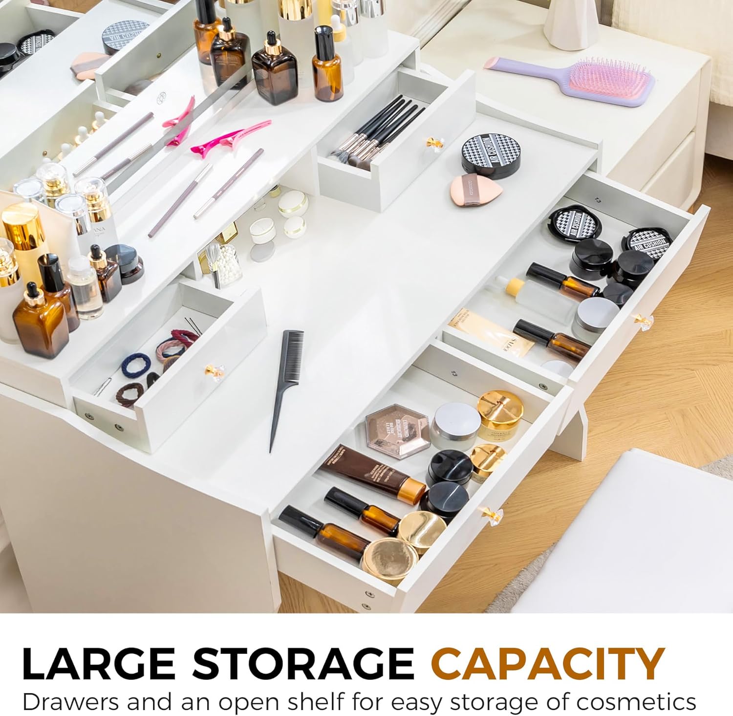 COMHOMA Makeup Vanity Desk with Mirror and Lights, Vanity Table and Chair Set with 5 Drawers and Charging Station, Bedroom Dresser LED Mirror Stepless Dimmable & 3 Color Modes Adjustable, White