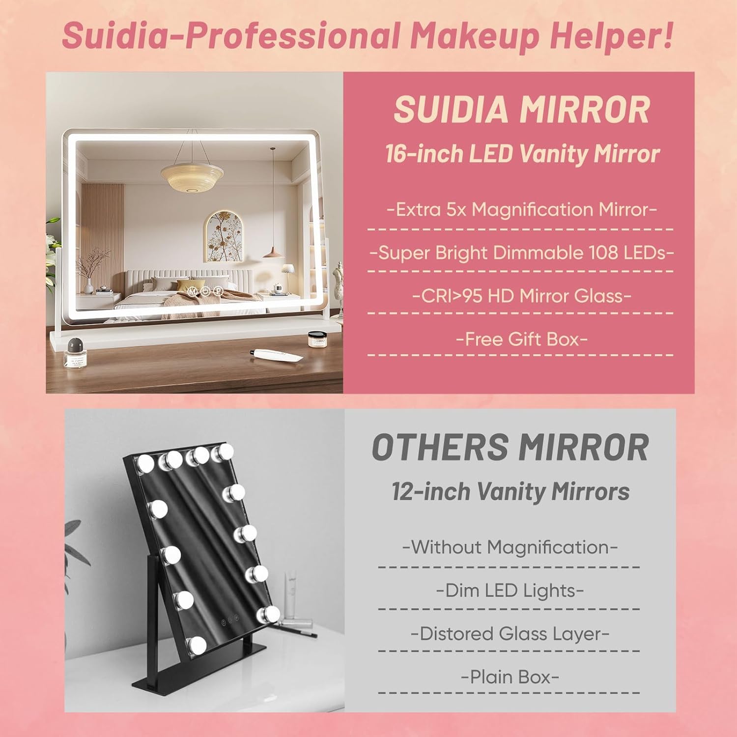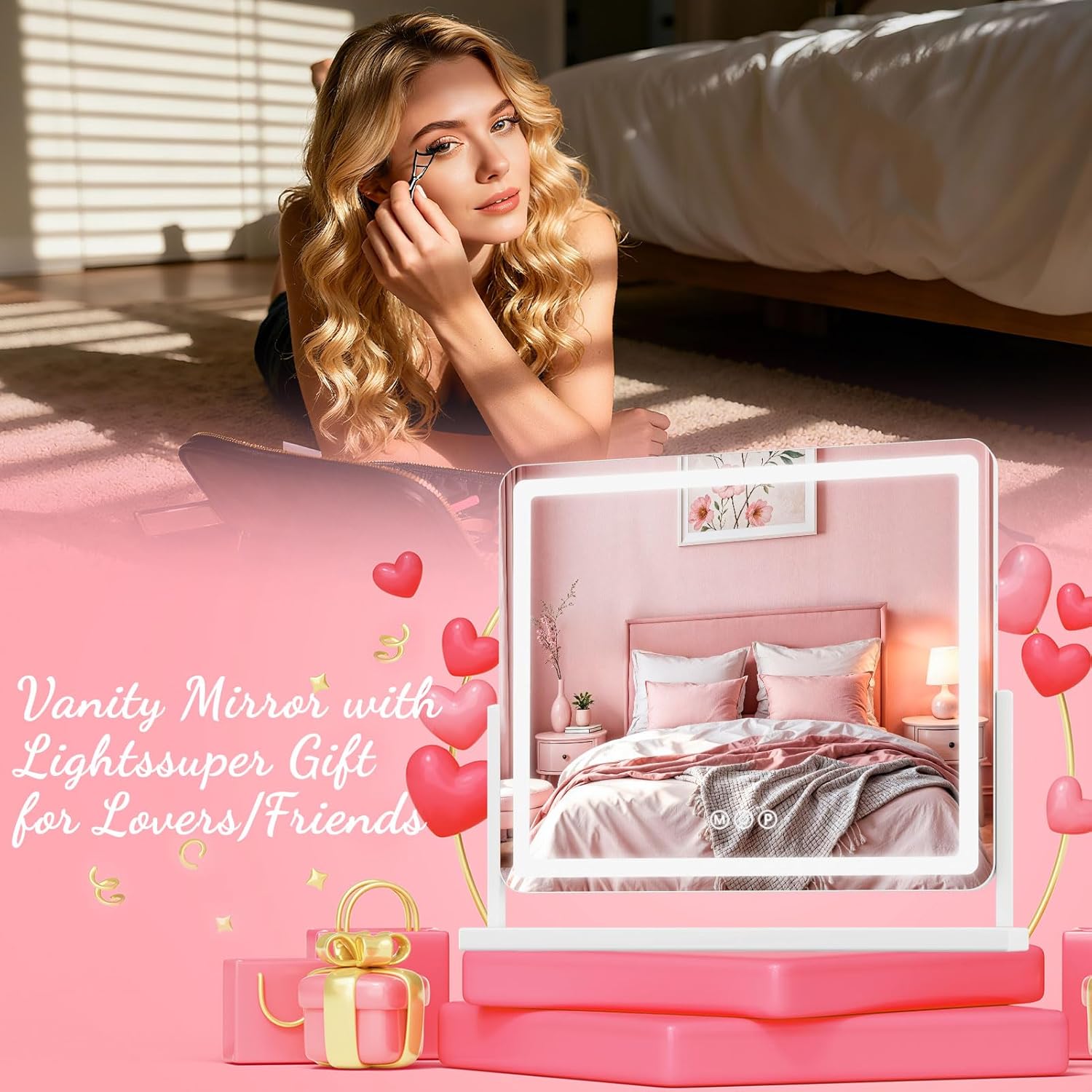 Suidia Vanity Mirror with Lights, 32"×22" LED Makeup Mirror with Light, Smart Touch with 3-Color Lighting, 360°Ratation for Vanity Desk Tabletop,White,Lamp Belt Style