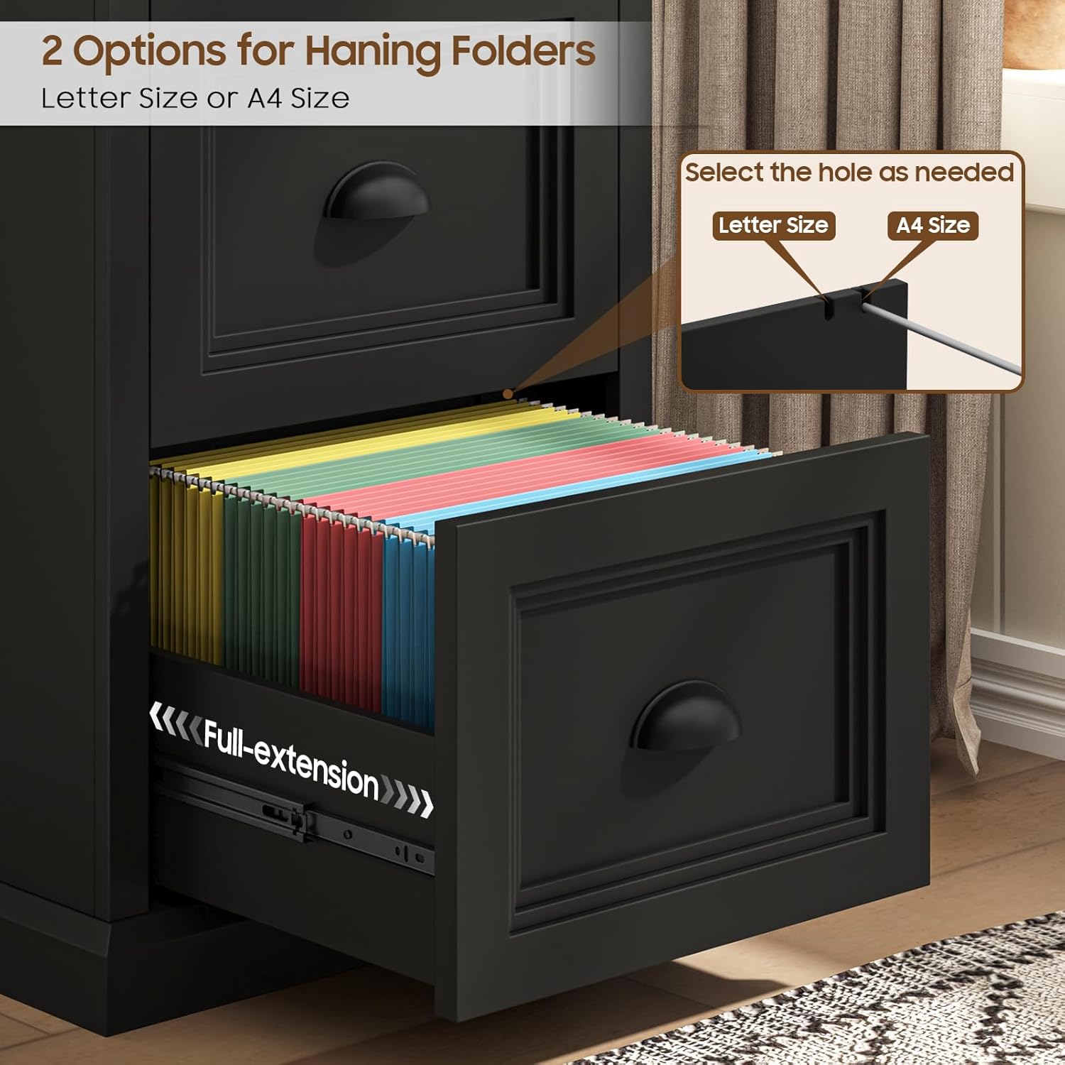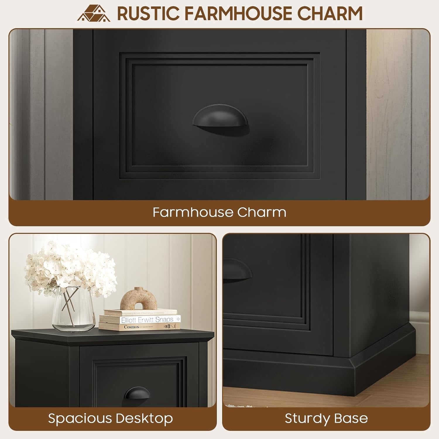 Vertical File Cabinet, Filing Cabinet with 2 File Drawers, Farmhouse Small File Cabinet Fits Letter/A4 Size, Wooden Printer Stand, Under Desk Cabinets for Home Office, Black