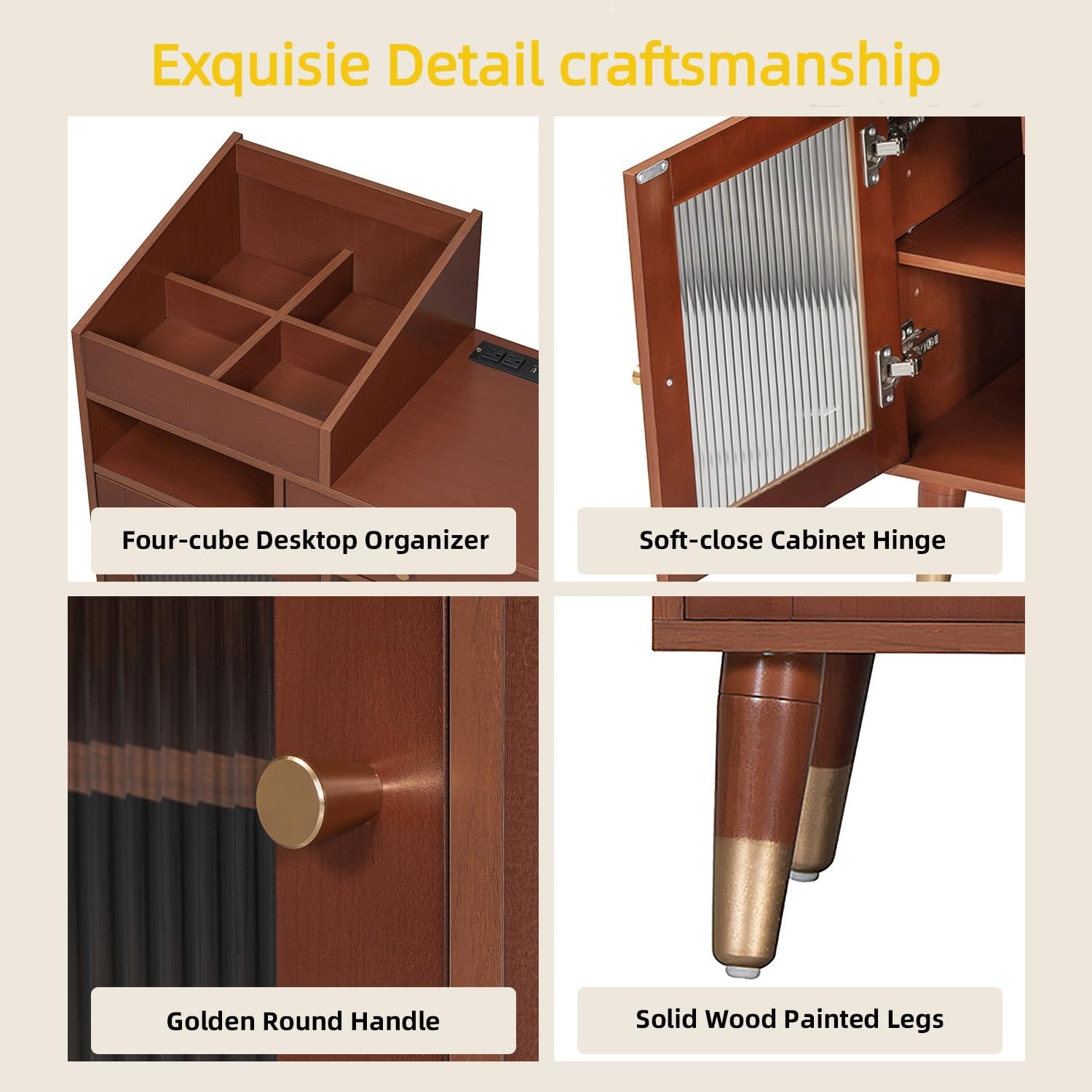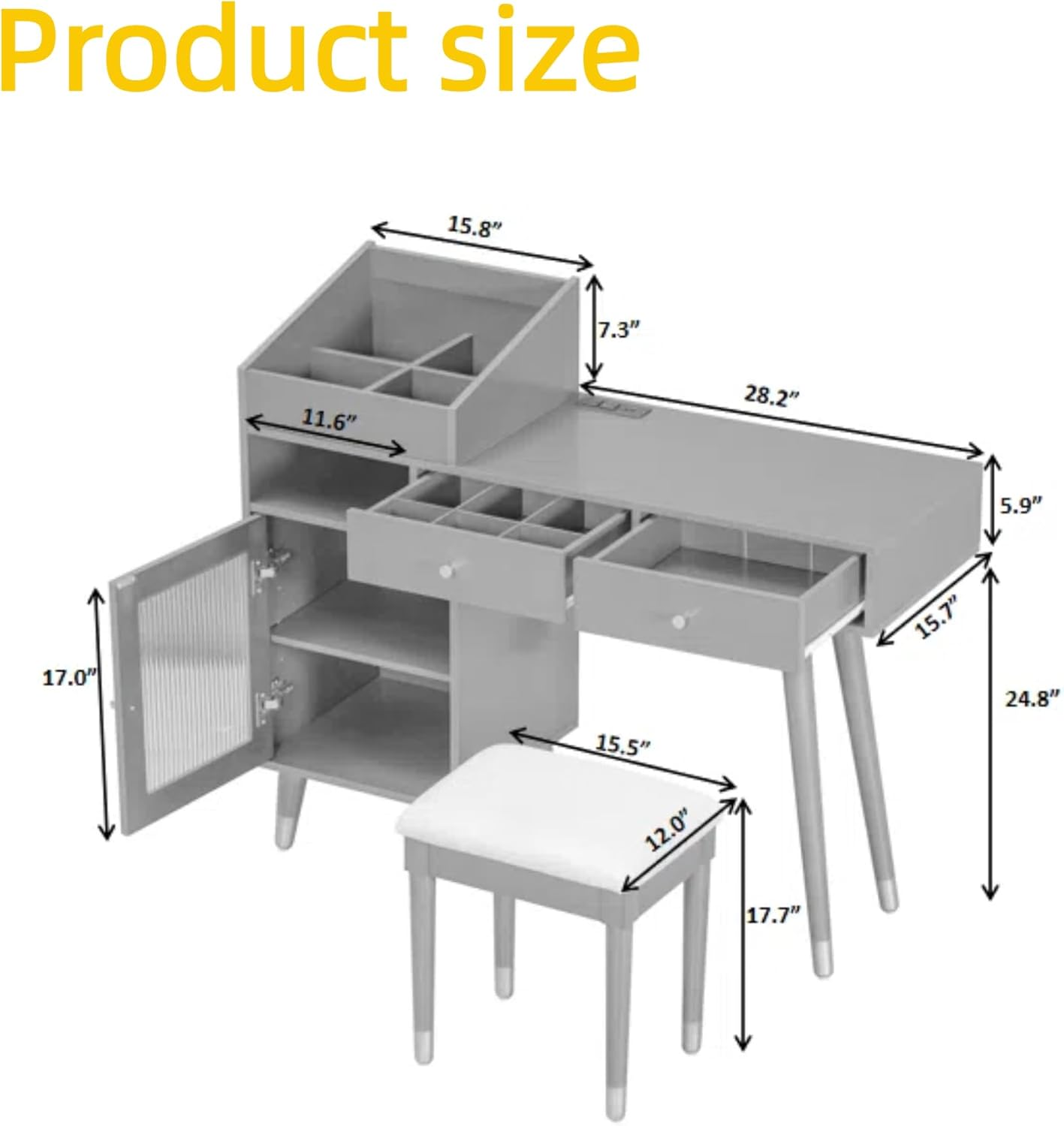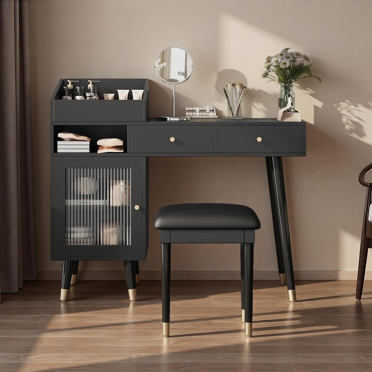 Trygoal Wooden Makeup Vanity Desk, Modern Dressing Table with Spacious Desktop & Large Drawer, Stool, Space-saving Dresser Table with Side Cabinets & Charging Port for Small Places, Walnut